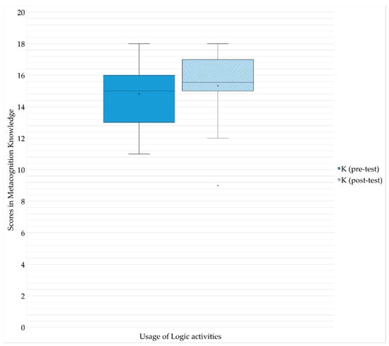 Graphic representation of the differences between the descriptive statistical scores for Metacognition Knowledge (K) with the use of teaching applications that address logical–mathematical skills. The statistical representations correspond with students who completed the pre-test and post-test and played Logic activities. Number of students = 71.
