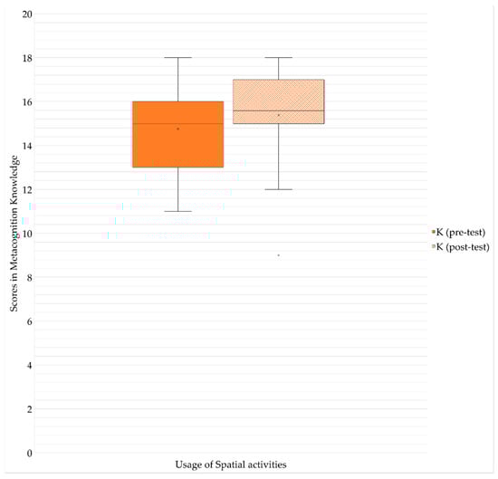 Graphic representation of the differences between the descriptive statistical scores for Metacognition Knowledge (K) with the use of teaching applications that address visuospatial skills. The statistical representations correspond to students who completed the pre-test and post-test and played Spatial activities. Number of students = 67.