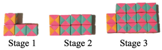 Task 2.1 consisted in determining, based on the first three stages of a sequence, a general rule that would define all the stages of the sequence. Task 2.2 involved building, with tangible materials (origami cubes), three stages of any sequence. To perform Task 2.1, the students were shown four different construction sequences of the cubes, some with lineal generalization rules, others with quadratic rules. One of the quadratic rules is shown below (Figure 1).