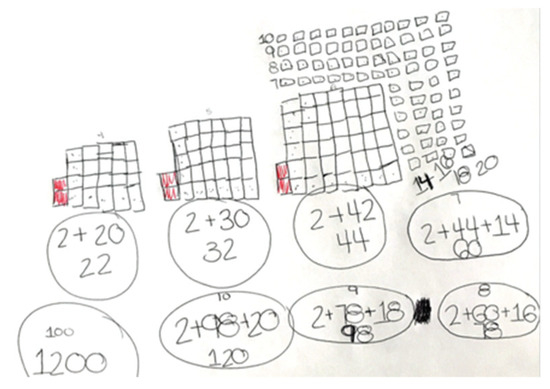 Pair C manifested creative mathematical activity by optimizing a technique based on counting and generating a novel technique; that consisted of determining the number of cubes by multiplying the number of the stage by the number of the stage +1. This entailed relating and adapting the rows of cubes to the floors of a building. This relation did not emerge from just their knowledge of math, but involved aspects of real life (F1, F2, F4). These students adapted the decomposition technique presented in Task 2.1 (based on identifying the stages of the sequence by separating the two colour combinations) to deconstruct [43] each stage into three distinct organizations (Figure 5): a constant (2), a square (, and a line (). This enabled them to propose a new technique to solve the task that evidences the development of F1, F3 and F4.