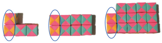 When pair C finished, the instructor asked them to explain their techniques to the group, and then continue with Task 2.2, which involved constructing three figures of a sequence with the origami cubes following a pattern similar to the previous ones. They were informed that other teams would have to determine the number of cubes required to construct stage 100 of the sequences posited. Figure 6 shows some of the sequences they constructed.