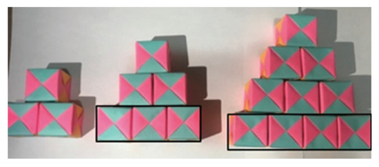 The technique required to solve this task entails constructing a relation between the number of cubes in each figure generated for each term, following three main steps: (1) studying the first three stages to construct an initial rule that determines a relation between the number of cubes and the stage of the sequence (Figure 2); (2) constructing a rule for the stage (Table 3); and (3) verifying the general rule for the stage , which can be demonstrated using the induction principle and, for these students, proving that rule for different stages.