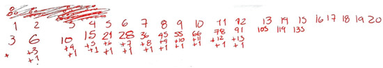 | Step 1. Using the tangible material, they counted the number of intersections for the first 5 stages, including the intersections that do not appear visually (Figure 5). Step 2. They constructed a recursive process for the first 8 lines based on the differences between stages and that is: with 2 lines, one intersection; with 3 lines, intersections; with 4 lines, intersections; with 5 lines, intersections; and with 6 lines intersections; so with 7 lines the number of intersections will be the same as with 6 lines plus 6: intersections, and with 8 lines the number will be the same as with 7 lines plus 7: intersections (Figure 12). Step 3. They identified that the technique associated with the pyramid task (Figure 4) can be applied to solve the intersection task, as well, though they recalled that the earlier task was not solved. Step 4. They determined which task is solved by adding up consecutive positive whole numbers, such that . Step 5. They related a famous technique from Carl Friedrich Gauss (Hayes, 2006) to add up the first consecutive positive numbers (Figure 13) that the instructor had mentioned briefly in the first session. Step 6. They determined the value of the sum by forming pairs between the 10 initial and 10 final numbers, as shown here: until they obtained Finally, they stated that this process must be repeated up to the number 50, but that this technique is not effective for any number of lines stipulated, so they continued trying to come up with an algebraic rule. Step 7. The instructor asked them to perform the same activity, but with 20 lines. This led to the following conclusion: taking away one (leaving 19), dividing by two (leaving 9.5), taking only the 9 (the whole part) and multiplying (making 180) plus the one in the half, leaves 190 intersections. Step 8: They verified this technique with one member’s results for 20 lines and then implemented it for 100 lines: , taking 49, multiplying it by 100, and adding 50 from the half to obtain the result of 4,950 intersections. | Based on the first 5 cases, they considered a relation of dependence between and that led to the recursive rule: . They constructed two rules of algebraic generalization for lines: They optimized their technique by passing from the tangible material to a recursive rule. They recognized the applicability of a technique based on considering three types of tasks: the intersection task, the pyramid task, and the task of the sum of the first 100 positive whole numbers (F3, F4). They adapted Gauss’ technique for the first 10 whole positive numbers for the sum of the first 99 numbers (F4). They optimized the technique of adding pairs and constructed a rule of algebraic generalization (F2). |