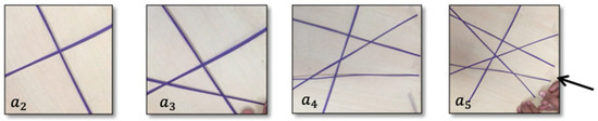 The tasks defined for each situation (Table 2) permitted constructing lineal, quadratic, or exponential general rules. Task 6.3 has the most challenging algebraic generalization rule: for all . It is important to clarify that this study did not expect the students to construct expressions with alphanumeric algebraic syntaxes, but generalizations of algebraic type, understood from the perspective of Radford as factual, contextual, or symbolic [40]. Though all six situations shared the goal of reaching an algebraic expression, certain specific elements were not common: for example, the use of didactic material (situations 2, 4, 5), problem posing (situation 2), and managing concepts foreign to traditional instruction (situation 1).