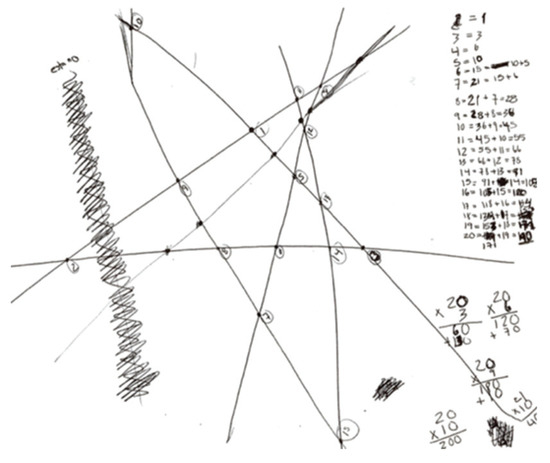The conditions established for the MC included an institutional setting in which the students worked in an environment propitious for generating creative mathematical activity, and where the roles assigned to the instructor and parents enhanced the conditions in which the didactic design—based on a local praxeology—was implemented. In addition to ensuring the regular participation of their children, the parents participated actively in the MC in the first and last sessions. As Bicknell [47] and Feldhusen [48] proposed, the parents’ participation is an important element in developing mathematical talent. It is important to emphasize that the instructor’s participation in every situation included in the didactic design was fundamental as well, as illustrated by the selection of the sub-task that entailed determining the number of intersections for 20 lines that the instructor proposed to pair B. This allowed those students to recognize that the clearly-stated pattern for the first ten numbers was easily verified for the 20-line case, and so could be generalized to 100 lines. Without doubt, planning these sessions entailed great complexity, for the activities proposed in the didactic design could be performed using diverse techniques and entailed generating proposals for “sub-tasks” that allowed the students to approach the task situations presented. This leads the authors to recommend elaborating a guide for instructors. In this regard, it is sustained that elaborating a guide for teachers—even holding workshops to professionalize teaching—is necessary for the implementation of such a didactic design. This paper could provide a basis for producing both.