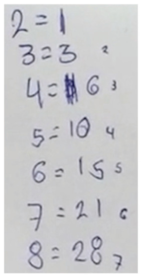 Algebraic generalization appears when a verbal rule or expression is constructed on the basis of the stages of the perceptual field or recursive rule that determines a relation of dependence between any stage and the stage of the sequence (with no need to obtain the previous term, ). This permits the determination of both “close” and “distant” values [41,42,43,44].