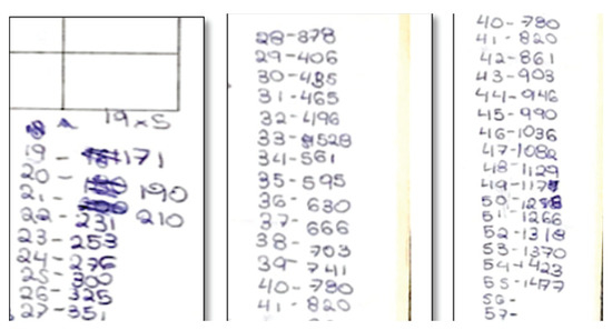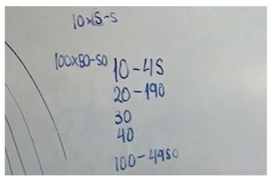 | Step 1. Using the tangible material, they counted the number of intersections for the first 6 lines, after arranging them so that all intersections were visible. Step 2. Same as pair B, but followed this rule up to 18 lines. Based on this step, they proposed their own techniques, which were discussed at a couple different moments. Step 3. (Member 1). With the goal of detecting a pattern that would allow her/him to construct an algebraic rule, he continued to apply this recursive rule up to 55 lines (Figure 14). Step 3. (Member 2). This student related the technique associated with the pyramid cube task (Figure 4), realizing that it could be used to solve the intersection task. This student showed the instructor a sheet where –on his own initiative– he had resolved the pyramid cube task using the recursive rule one-by-one up to . He mentioned that the numbers are the same, but ‘go two behind’; that is, ‘If the number of lines here is five, there it would be pyramid 3’. Though this student recognized that this new task is solved using pyramid 98, he continued to search for a more direct way. Step 4. (Member 1). Once this student had a sufficient number of cases (55 lines), he identified a pattern based on ‘tens’ (10, 20, 30, 40…). He explained the process on the blackboard (Figure 15): ‘The way in which it is possible to reach 45 is by multiplying 10 × 5—the half– and subtracting 5 to reach 45. I made it to 50 this way, one-by-one and verified it [algebraic rule] for 20, 30 and 40, and it worked; for example, for 20 I obtained 190, because it’s 20 × 10, which is half of 20 minus 10, and that gives 190. I did the same with 30, 40… up to 100. What I did was 100 × 50 minus 50, which is half. That gave me 4950”. | Based on the first 6 cases, they structured a relation of dependence between and , and later constructed the recursive rule: . They constructed a rule of algebraic generalization to find the number of intersections of lines: . They optimized their technique by passing from the tangible material to a recursive rule (F2). Member 2 recognized the applicability of a technique with respect to two task types: pyramid cubes and line intersections. He identified the similarities and differences between the tasks in order to implement the technique (F3, F4). Member 1 optimized his recursive technique and produced a unique technique based on ‘tens’. He verified that this new technique worked for other cases (F1, F2). |