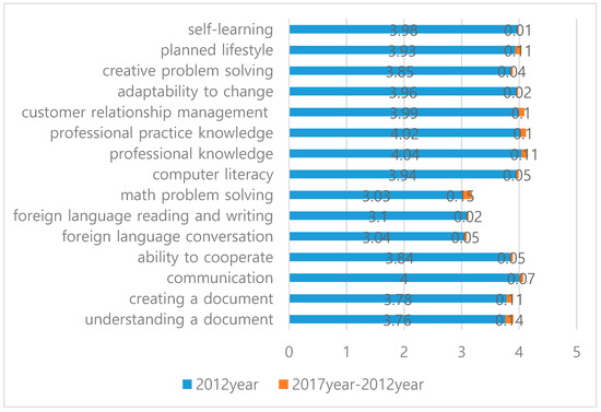 A goal of the study was to identify whether the degree of importance placed on imparting essential job competencies had changed over the past five years by analyzing the perceptions of the science and engineering graduates who responded to the survey (See Table 4 and Figure 1). According to the survey administered in 2012, the items were ranked as follows: “professional knowledge”, “professional practice knowledge”, “communication”, “ability to cooperate”, and “self-learning”. In 2017, the items were ranked somewhat differently: “professional knowledge”, “professional practice knowledge”, “ability to cooperate”, “communication”, and “planned lifestyle”. In terms of the differences in the means of items related to perceptions of the importance of the competencies over the past five years, there were great differences in respondents’ rankings of the importance of practical skills, such as “math problem solving”, “understanding a document”, “professional knowledge”, “creating a document”, and “planned lifestyle”. There were some changes in perceptions of the importance of various essential job competencies over time and according to the experience level of respondents.