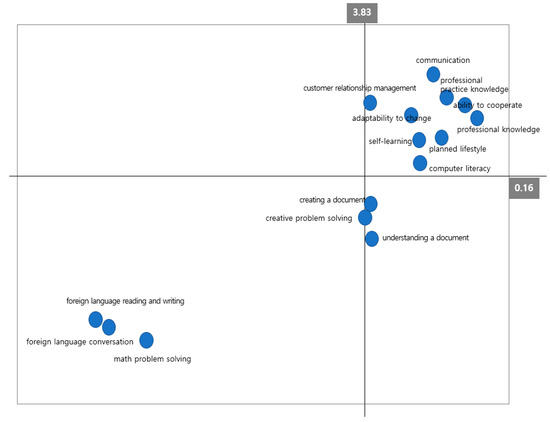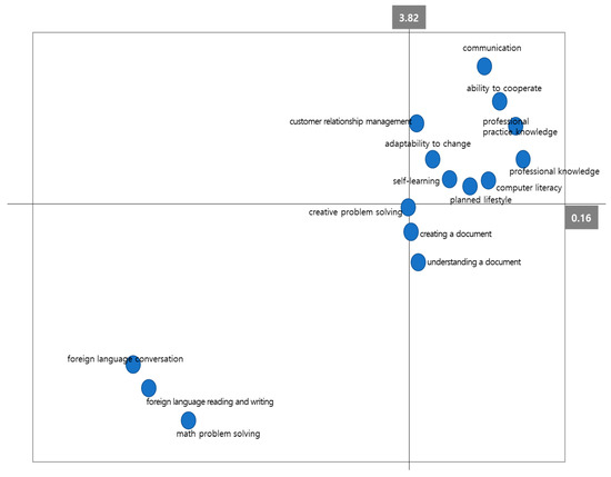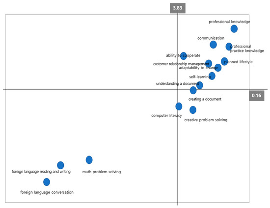The analysis of the locus for focus model shows that competencies located in the first quadrant, which, out of the four quadrants, indicated high importance and contribution, included communication, cooperation with others, adaptability to change, and self-learning skills. These competencies are considered to be necessary as we move toward a future society. The results mean that, in addition to gaining specialized knowledge, developing abilities to perform tasks by using knowledge from universities is required. Therefore, universities are expected to provide students with a curriculum focusing on team activities in preparation for the future society. In addition, college students need to experience a capstone design to solve real problems by utilizing their knowledge, as well as short-term and long-term internships at companies related to their major. The design thinking process has recently been used to develop creative ideas, and the process should also be actively used within the curriculum. In addition, it is necessary to encourage students to demonstrate initiative and creative thinking by helping them develop an entrepreneurial spirit, as explained by KEEN [36]. By doing so, competencies of high importance will be improved across the university curriculum.