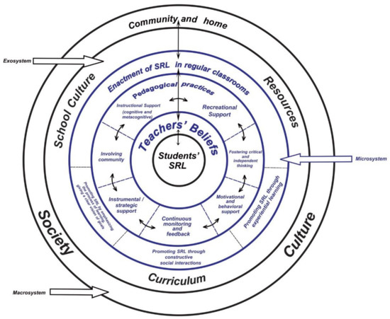 These interactions are further shaped by the curriculum, resources, and school culture that exert a reciprocal influence on the teacher and his/her practices in the classroom. These influences are consistent with the dynamic interactions in the exosystem of Bronfenbrenner’s system-ecological perspective [29,30]. Finally, the macrosystem (e.g., home, community, society) affects and is affected by the exo- and microsystem in which teachers support students’ SRL. All these subsystems are interrelated and mutually dependent. This implies that, together, these can strengthen or weaken teachers’ efforts to promote students’ SRL.
