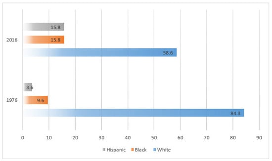 Percentages of students enrolled in U.S. colleges and universities in fall 1976 and fall 2016 as a function of race/ethnicity. Adapted from the National Center for Education Statistics. (2015). Projection of Education Statistics to 2024: Forty-third Edition. Retrieved from https://nces.ed.gov/pubs2016/2016013.pdf.