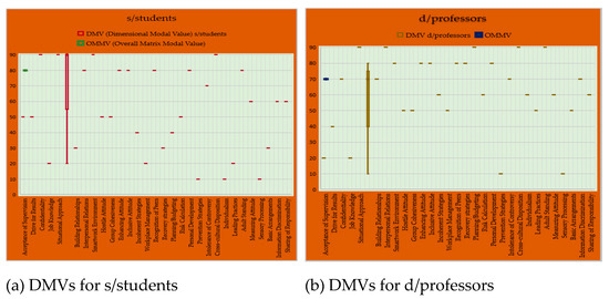 As shown in Figure 3, the scores are the dimensional modal values (DMVs) that the four university groups used to scale the pictures and definitions of the chosen test based on their qualitative scores (qs). Each DMV group is also compared to the modal value for the overall score matrix in each group (the OMMVs).