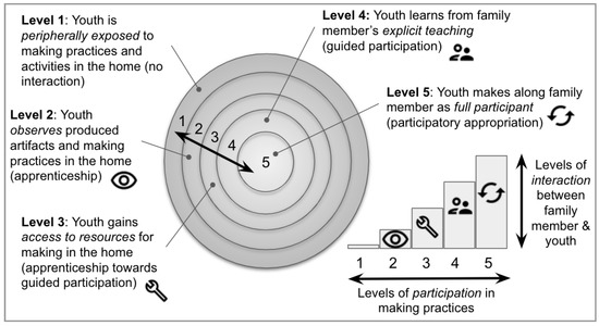 Relationships between family members can support the development of interest-driven projects connected to community resources [19,20]. These relationships may be characterized in different ways. For example, Brahms and Werner [19] found that family learning was dependent on the parents’ and grandparents’ involvement when young children were making in a museum makerspace. In Brahms and Werner’s observations, adult family members actively engaged in activities with their children, learning and working with their children, coaching and encouraging them, and even sharing personal making-related stories from their family history. From Blum-Ross and Livingstone’s study [21] of three different makerspaces, parents interacted in ways that the authors labeled: babysitting, supervising, cheerleading, collaborating, parallel-playing, and as connectors to prior experiences and other contexts. Importantly, we argue that regardless of the precise role family members play, supportive relationships are key to connecting youth interest-driven making to future opportunities and pathways for making.