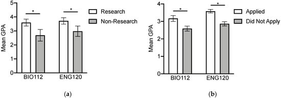 Although many studies have demonstrated gains by research students compared to their peers, fewer have addressed higher-order thinking skills, such as the development of a complex epistemological understanding of science or the ability to manage the ambiguity and uncertainty inherent to the practice of science [,,]. Therefore, the purpose of this study was to determine if there were differences in academic performance between students engaged in research and those who chose not to engage in research experiences. We hypothesized that an undergraduate research experience should improve students’ writing.