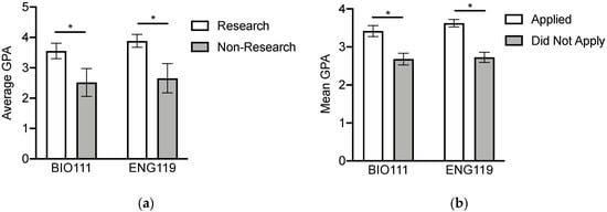 Students who were selected to participate in the research program outperformed their peers before the research started (i.e., in the fall semester). (a) Students who were selected to participate in the research program during the upcoming spring semester outperformed their peers during the fall semester. (b) Students who applied to the research program earned higher grades than students who did not apply. (* Denotes statistically significant difference in GPA. Error bars represent two standard errors both above and below the mean.).