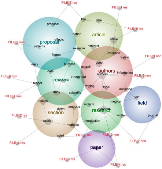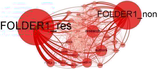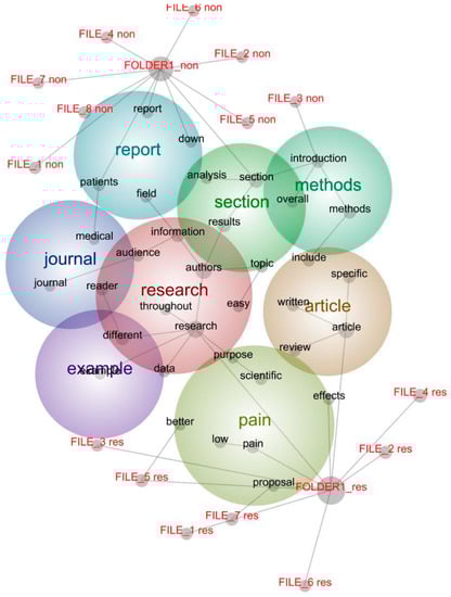 Further analysis of the writing samples was conducted using Leximancer (see Figure 3; Figure 4 for the emergent concepts and themes two ways). We combined all the files from both the non-research and research groups as if they came from a single sample (see Figure 3). This approach emphasizes the association between each file and individual concepts. Then, the files were grouped into two folders, Folder1_non and Folder1_res, representing the non-research and research samples (see Figure 4). This approach highlights the associations between each group and individual concepts. Concepts and files near to one another co-occur more frequently than concepts and files that are further apart (see Figure 3 and Figure 4). In other words, the proximity of concepts, files, and folders is strongly related to co-occurrence in Leximancer concept maps. A delimitation of this approach is that only the most likely co-occurrences are shown as edges. Less likely co-occurrences are not shown at all.