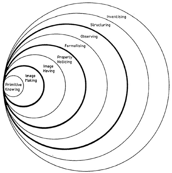 The Pirie–Kieren theory [15] contains eight potential layers of action for describing a person’s growth in understanding of a specified concept (Figure 1). The eight nested circles provide a two-dimensional diagrammatic representation of the theory. This nesting illustrates that each layer contains all previous layers and is included in all subsequent layers to emphasize the embedded nature of mathematical understanding. Although the more abstract and general understanding becomes as the rings of the model expand outward, growth in understanding is not seen to happen in such a linear way. Instead, growth occurs through a continual movement back and forth within the layers of knowing.