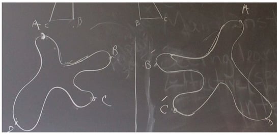 Teacher: Mathematically, when we say something changes the orientation, it’s a little bit different. So, I was trying to understand what you meant. (Moves closer to the blackboard) if I start at this point (referring to in Figure 2), and move along that path, then the image of that motion would just be reversed. So, if this is , that’s ; if this is , it’s , right? If this is , where’s ? Here? (Students agree). When this is , this is . Now, let’s read. clockwise. Here, . That’s what we mean mathematically when you said orientation changes. With reflection, notice that we said my left was her right and that her right was my left. We say the orientation changes. But with rotation, it stays the same. I’m telling you that because I want us to have the same language.