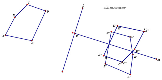 Encouraging image reviewing consists of teacher interventions that engaged students in reviewing and reflecting on their current mathematical activities. Developing mathematical understanding frequently involves carrying out specific activities to form an initial conception for the meaning of a mathematical concept or a preliminary idea for solving a particular mathematical problem. However, learners, who are simply taking actions on mathematical objects, might see their previous actions as completed and, therefore, might not automatically look back and reflect on their current work. External interventions might be necessary to engage learners in reviewing and reflecting on actions taken on mathematical objects and the product resulting from those actions. Through reviewing and reflecting on their current work, students might adjust their behavior and form a tentative idea regarding how to solve the problem at hand. This type of teacher intervention allowed students to alter their actions without having yet developed a clear mental plan for solving a problem. Vignette 3 presents an illustrative example of teacher engaging students in reviewing and reflecting on their current mathematical work in their process of developing a procedure for finding two reflections whose composition would produce the same image as a given rotation. The event started with the teacher asking students to find two reflections whose composition would produce the same image as 180 rotation. Although the two reflections that students suggested to use did not produce the desired image (Figure 3), the teacher engaged them in reviewing the diagram on the screen, hoping that they would extract information to guide their subsequent actions.