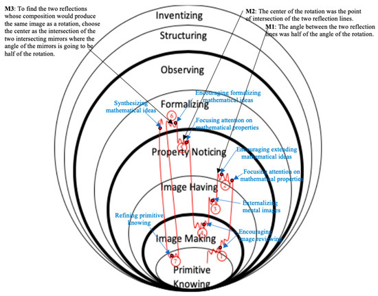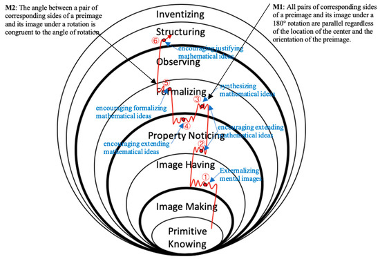There is evidence that in classrooms that tend to support inquiry, teachers frequently exhibit eliciting actions, as they ask students to share ideas and then use them to encourage group discourse. The most prevalent supporting actions reported in the literature include reminding students of task goals and what they already know, revoicing learners’ ideas, and introducing alternative strategies and conceptual explanations [6,8,9]. Although common practices associated with extending have been conceptualized to include encouraging reasoning, encouraging reflection, pressing for justification and generalization, and creating a space for the development of new mathematical insights [6,7,9], the potential outcome of these actions relative to learners’ mathematical cognition remains unclear. In this work, we examined the types of teacher interventions that seemingly assisted a cohort of middle school students in discovering and generalizing the properties of geometric transformations in a dynamic geometry environment. Relying on the Pirie–Kieren theory of growth in mathematical understanding, we traced the specific domains of mathematical understanding that were provoked, promoted, or established in the presence of these interventions. Our data analysis focused on identifying teacher intervention types and their impact on students’ mathematical development. Specific questions guiding our analysis included: (1) What are the types of teacher interventions that support students in discovering and generalizing the properties of geometric transformations in a dynamic geometry environment? (2) How does students’ mathematical understanding evolve in the presence of these types of interventions?