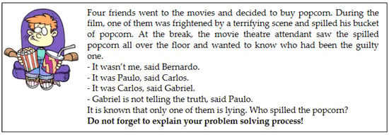 Given that all the students were attending the fifth and sixth grades, their learning of formal logic in school is inexistent, and logical reasoning is very limited in their mathematics lessons, as it is delayed to more advanced school levels in the Portuguese curriculum. However, over several years of implementation of the mathematical problem-solving competition, it was observed that analytical reasoning problems, compared with several other non-routine problems proposed, were among the competitors’ favorites, apparently because they incite their curiosity and appeal to their cleverness []. This suggests that such problems deserve new attention from school mathematics concerning the development of deductive reasoning. The importance of knowing how children reason deductively on such contextual logical problems is thus justified. Moreover, since young children do not yet master the language of formal logic, it is also important to understand how they express their deductive reasoning with their language and representational resources.