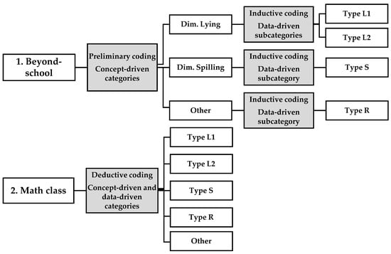 The coding process was firstly applied to the body of solutions from the beyond-school scenario because their number was higher and, therefore, they could be more diverse. Next, using the obtained categories and subcategories as the established coding frame, the analysis was applied to the body of solutions from the mathematics class (Figure 2). Finally, a comparison was made between the results from the two bodies of data.