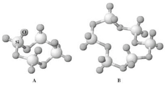 Schematic diagram of the more common types of primary cyclic arrangements of the structural units SiO4 in xerogels: (A) four-member siloxane ring (SiO)4 and (B) six-member siloxane ring (SiO)6. (Reproduced from [17] with kind permission.)