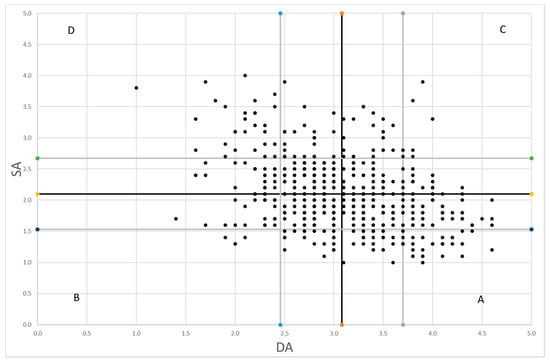 Regarding the gender, there were no differences in the DA values, but SA values were lower in the case of females, leading to higher differences between DA and SA in this gender. In the case of level of instruction, DA and SA values showed no differences between Bachelor (BSc) and master levels. Nevertheless, p-values in both cases were below 0.1 and the difference between DA and SA was higher in master’s degrees (Figure 1 and Figure 2).