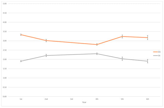 The evolution of DA and SA values was further analyzed. Within the year of study, DA values were higher than SA. This result was confirmed when the specific mean DA and SA values were compared on a per student basis (Figure 1), and only a low proportion of SA mean values were higher than DA. Specifically, it was the case of only 65 students out of 505 (62 of bachelor level and 3 of master level) indicating in these cases a clear higher surface approach to learning. Nevertheless, different DA and SA values were found depending on the year of study (1st, 2nd, and 4th in BSc and 5th and 6th in master). Higher DA mean values were obtained in the first year of BSc and in both years of master level. Accordingly, mean SA values for these years were lower than those obtained for 2nd and 4th years of BSc (Table 3). The differences between mean DA and SA values also varied during the years. The highest values were obtained in the first year of BSc studies, then they dropped in the 2nd and especially in the 4th year and started to raise again in the 5th year. This trend was determined by the evolution of mean DA and SA values. DA was higher in the first year, dropped during the rest of years of BSc studies and raised again at the master years, while SA followed the opposite trend (Figure 2). Also, differences were observed between compulsory or elective subjects (DA: 3.19 ± 0.03 vs. 2.76 ± 0.05 and SA: 2.01 ± 0.03 vs. 2.35 ± 0.06), but as all the elective subjects were in fourth year when comparison was made between subjects of the same year, no differences between compulsory and elective subjects were detected.