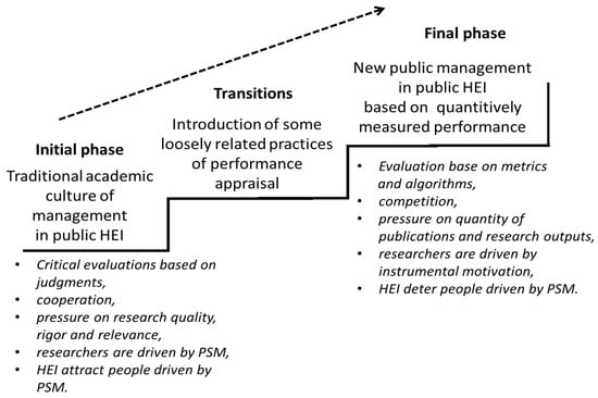 As the black arrows in Figure 1 indicate, the journey from traditional academic culture to new public management starts from the traditional academic system of prestige and social relations and goes through the transitional phase of initial development of some loosely related forms of performance measurement to a performance appraisal system fully integrated in HR management in academia. The presumed aim of this transformation is to improve accountability of HEIs and manage them in more effective ways. However, as we propose at the lower part of Figure 1, as the HEIs move forward, the measurement defining academics status as well as the other unintended consequences of PA might turn PSM of academics into instrumental motivations. Thus, we suggest that besides desired changes in HR management such as accountability, objective measurement, the process from initial to final phase is also related to the unintended changes in the academic job characteristic leading to substitution of PSM by instrumental motivation to attaining a high enough evaluation score. Obviously, this model in Figure 1 is rather heuristic, specific phases might have different lengths and courses depending on the cultural or organisational context, but the general mechanism seems to be always the same; as HEIs approach the final phase of incorporating NPM, the characteristic of job changes and PSM of academics might decrease. With this conceptual model as a background for our analysis, we would like to highlight that, besides some normative positive consequence as accountability and objective measurement, the introduction of NPM into academia might also have some unintended negative consequences in the form of changing the nature of the job and diminishing public service motivation of researchers.