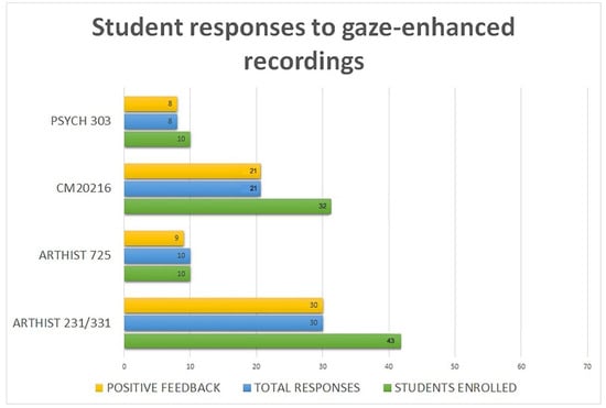 For year one, the project started with (i) recording and enhancement, (ii) playback to pilot courses and (iii) evaluation for the courses chosen for the pilot group. The pilot group consisted of PSYCH 303, CM20216, ARTHIST 725 and ARTHIST 231/331. These were the only courses for which we had questionnaires and feedback, in year one of the project. It was important to establish student involvement and engagement and the results are provided below. In year two of the project, we attempted to focus on the lecturers themselves and how they interpreted the eye recordings for their own self-reflection on pedagogy. We believe that this mixed approach in the methodology clearly demarcates the different ways in which this technology is beneficial for both students and lecturers. Gaze recordings were created using a Tobii T120 eye gaze tracker. The eye tracker built into 17-inch TFT monitor had a resolution of 1280 × 1024 pixels. A variety of software was used to record, analyse and annotate gaze recordings, including Tobii Studio and custom applications. The end products were standard MP4 video files.