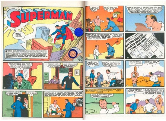 As a control experiment, for MEDIA 327/222 Comics and Visual Narrative, we chose pages from a 1939 Superman story that, aside from the half-page title panel, obeyed a regular eight-panel page (Figure 2). To this we added examples of contemporary comics that, while observing elements of the iconic grid, also presented specific issues such as reading across a double-page (Figure 3). We chose these because we were especially interested to examine the tension between reading and looking at images. Reading includes the linear and disciplined reading of captions and speech balloons as well as following the conventional Z-shaped navigation through the page. By contrast, scanning often involves looking at the whole page, or parts of the page, before reading properly starts. This is akin to the scanpaths mentioned in the section on art above. As James Elkins has noted [], this play between reading and looking takes place in any visual medium, but it is especially interesting in a medium where a set of differentiated units that form a serial narrative are all available to view at once.