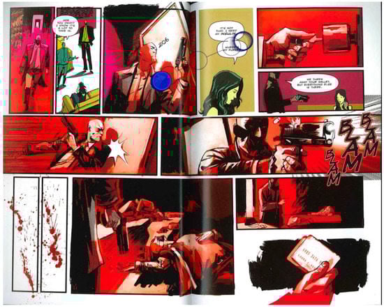 This ebb and flow was even more pronounced in the double-page taken from The Homeland Directive (Figure 4). Here the reader is asked to follow a strip across both pages before moving down. It is also a highly dynamic page as the majority of it depicts an attempted assassination in a hotel room. The requirement to move across the page did not cause a problem for viewers, but what was noticeable was that without having already established a reading rhythm and without a strong opening panel (such as the titular panel in the Superman comic), many readers started close to the middle of the double page before moving towards the start point in the top left-hand corner, with one viewer actually spending some time digesting the final panel (bottom right) before moving to the top of the left-hand page. Additionally, of interest here is the fact that the pages were not text-heavy. While the Z-movement is one way of establishing reading direction, the positioning of text is another key component used to direct the movement of the eye. In the absence of this component, the scanpaths became much more pronounced and also idiosyncratic, although it was possible to detect circular movements around sections of four of five panels as different viewers sought to make sense of the co-presence of elements. Using eye-tracking technology for the comics course provided an excellent heuristic device and an important pedagogical tool in that we can now show students exactly what people do when they “read” comics. It perfectly illustrates the ebb and flow across current and previous elements within a series, the play between textual and visual components within a panel, the difference between reading and looking (and often the priority of looking), the irregularity and non-linear navigation of the page and the significance of all the elements being co-present and available to be “read” simultaneously. It was also really useful for getting students to think about the page or the double-page as a single aesthetic unit that, much like a painting, sets up dynamic relationships among elements that can all be seen together. It thus provides an important tool in both the study of the medium and the creation of comics.