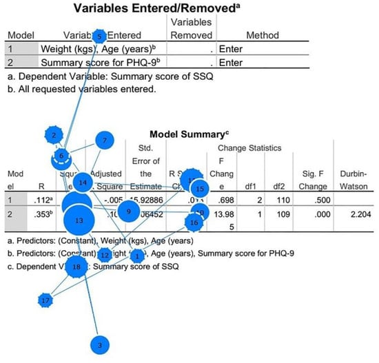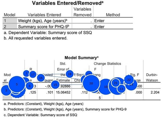 This course includes six lectures on using statistics with SPSS, a software package. Students learn to interpret the output from the program, which includes tables and graphs. Some of the tables/graphs contain more relevant information than others when trying to interpret the results. Students learn which tables contain the information regarding the main findings. The images used for this study were part of a previous exam question. The question asked students to write a results section based on the output from statistical analyses. The analysis was a multiple hierarchical regression. The question was on page 1, with tables on the subsequent three pages and graphs on the fourth page. The question was worth 10 marks out of 100 in a 2-h exam, which means students had around 12 min to answer the question.