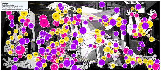 Two different students look at similar features of the picture (Picasso’s Guernica, 1933) in pink and yellow. The lecturer, however, indicated in purple, looks at more areas not viewed by students, and configurally—with a broader sweep of the painting.