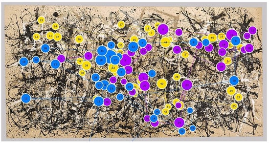 Finally, we used a famous abstract expressionist painting by Jackson Pollock (Figure 8). Figure 8 shows three novices with the different colours with the numbers showing the order by which each novice looked at things (1–45). We tend to understand vision, particularly that employed in looking at art, as a so-called free viewing experience. We tend to understand that individual differences in looking at things are common, but our team recorded the eye behaviour of individuals looking at the image revealing a remarkable consistency. Particularly striking are the areas ignored by vision. When played back to students, they learned that they could possibly try and look at low contrast areas as well as high contrast areas in order to get a more global and configural view of the image. It is also interesting that vision adopts various complex dynamics to inspect an image, and importantly this vision is only a reflection of the nonlinear dynamic aspects of thought. It is almost as if we believe that we think like a text from start to finish in sequential order but in fact our thought, our stream of consciousness, continually goes back and forth and jumbles up thought and sensations, as we have seen examples of in all the disciplines participating in this project. Students learn the importance of mindful visual searching as a great enhancement and demonstration by looking, in addition to instructions. This layered learning across the senses enforces and increases learning and aid memory and retrieval. This kind of multisensory learning should appeal to different abilities, learning styles and cultural backgrounds. This is somewhat different from comics, where stable anchor points were provided by the text areas.