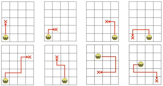 As stated, the mentoring experience with Bee-bot was carried out in a second-grade classroom formed by 24 students. The ages of the students ranged between 7 years 1 month and 8 years 1 month (M = 7 years 6 months, = 10 months). The mentors in charge of the experience were 9 students from the fourth primary grade selected by the teacher. It is important to mention that all the students of fourth grade completed a robotics-based instruction on Bee-bot prior to this experience. This fourth-grade robotic instruction consisted in a one-week program (45 min per day) based on coding Bee-bot to complete paths similar to those shown in Figure 1 with the coding box [38]. The selection criterion for these mentors was based on their grade qualifications in this one-week robotics-based instruction.