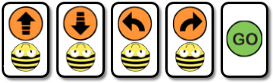 Bee-bot (Figure 2) is a commercial robot adapted to be child-used, and has been classified as a Tangible User Interface in the taxonomy of Strawhacker and Bers [39]. Bee-bot allows children to initiate their coding skills through visual instruction blocks presented as buttons on the top of the robot. Usually, the use of Bee-bot in education is intended to develop the coding skills and visuospatial abilities in early-years students (see [40,41,42], for example).