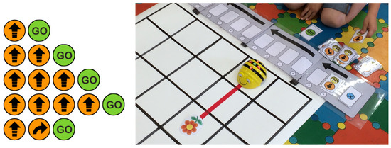 The 24 students of the second-grade classroom were divided into nine groups; each mentor was in charge of one group. In particular, six groups were formed by three students, and three groups were formed by two students. As described in Table 1, the first session opened with an introduction to robotics and coding. To better understand what coding means, the buttons and movements of Bee-bot were examined and described using the coding box with simple paths (described in Figure 4).