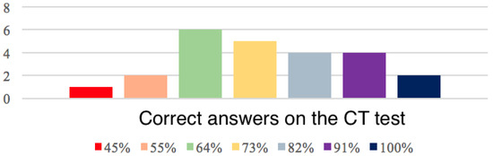 As described in the materials section, the acquisition of CT abilities was evaluated through a selection of 11 items of the validated CT test developed by Román-González et al. [45]. The test was filled out two days after the last of the sessions by all the students through the Plickers platform. Figure 5 shows the percentages of correct answers for the CT test. Out of a total of 11 questions, almost all the students (95%) answered more than five items on the CT test correctly. Only one student answered less than 45% of the questions related to CT skills. The rest of the students, despite the lack of previous knowledge on coding or sequencing instructions, solved more than 50% of the CT test items correctly.
