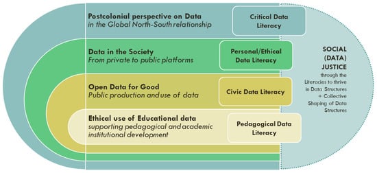 Integrated representation of the four dimensions and the data literacies in connection with a social justice’s vision.