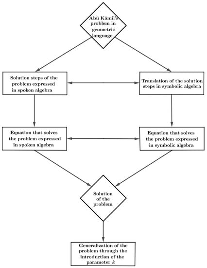 More specifically, the chosen problem is particularly suitable for showing the passages in which some properties, enumerated in Euclid’s Elements in geometric language, are translated into the rhetorical language of Arabic algebra, in order to write the resolutive equation of the problem; subsequently those passages that realize a translation of the same properties from the language of spoken algebra in the language of symbolic algebra and, finally, those that lead to the generalization of the problem through the use of a parameter. These passages are sketched in the flowchart shown in Figure 1.
