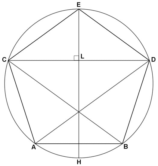 The name Abū Kāmil Shuja ibn Aslam ibn Muhammad ibn Shuja (850–930), also known as a-Hasib al-Misri, or as the Egyptian “calculator”, frequently occurs in the first Western algebraic tradition, when reference is made to the transmission of algebra. The name slowly disappears in the later Latin algebraic tradition, until finally lost without trace. Abū Kāmil is especially remembered by later generations as the first commentator on Kitāb al-jabr wa al-muqābala (Book of algebra and science of reduction and cancellation) by Muhammad ibn Mūsā al-Khwārizmī, written between 813 and 830 [42]. Commentary by Abū Kāmil is the Kitāb fī al-jabr wa al-muqābala (Book on algebra and science of reduction and cancellation), written before 870 (see Reference [43] for a historical collocation of Abū Kāmil’s work on algebra among Arab mathematicians). In this treatise, the author devoted a chapter to problems on the regular pentagon and decagon inscribed in or circumscribing a circle in which the Latin translation by Gerard (from the 12th century) can be found at the Bibliotèque Nationale de Paris (Ms. lat. 7377A).