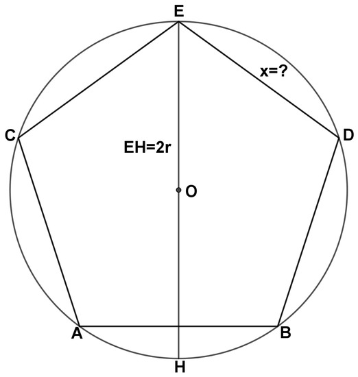 As mentioned above, to show students an example of connection between geometric knowledge and algebraic knowledge the first proposition is presented below in a didactic fashion. Figure 2 represents the original picture realized by Abū Kāmil (see Reference [1], pp. 524–525) to introduce the problem of finding the length of the side of the regular pentagon inscribed into a circle of diameter equal to 10.