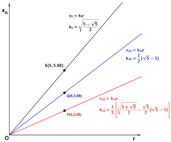 Such a situation is given a representation in terms of analytic geometry in Figure 4, in which some solutions of the generalized problem, , for the three values of corresponding to , and , are shown in the first quadrant of the Cartesian plane. The black half-line, in particular, represents the solution for the side of the regular pentagon inscribed in the circle of radius r and the point S is the solution found by Abū Kāmil, obtained in the case . Analogously, the blue and red half-lines represent the solutions for the regular decagon and polygon with 15 sides, respectively, and the points Q and P are the solutions found by Abū Kāmil.