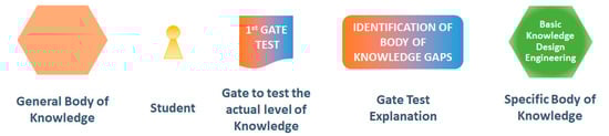 Figure 3 shows the main operators and symbols of the framework. The hexagon operator indicates the so-called body of knowledge: it represents competencies and skills already acquired or to be acquired by students. It can refer to either a generic or specific set of competencies. The yellow symbol in Figure 3 represents the student: it can be used to refer to students who have a general Bachelor of Science (BSc) in engineering or who are already following a specific master’s program in engineering. The light red and blue symbol in Figure 3 indicates a test moment for students in order to evaluate the pre-knowledge or knowledge acquired during the course. Finally, the light red and blue rectangular symbol represents the meaning of gate tests.