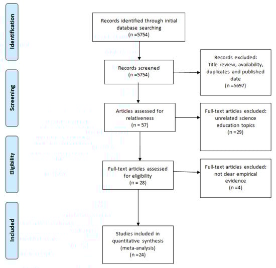 The initial search results in all databases produced a total of 5754 articles, as shown in Table 2. Based on duplicates, published date, and title review, and, based on relevance, abstract review, 5697 articles were excluded. The remaining 57 were scoped for further information. Studies that did not include the specific science education topics were 29 and were excluded too. The remaining 28 articles were carefully thoroughly reviewed in relevance to our criteria and research questions. A thematic analysis procedure was followed [103] during this process. Each author kept separate notes and read each article multiple times to properly comprehend its content, procedures, and methods used and findings displayed. All the information was then compared and discussed. From the 28 articles, four studies did not include any clear empirical evidence about the gamified practice and were removed. The 24 articles that composed the final dataset were included in the systematic review (Table 2). The PRISMA process that we followed is depicted in Figure 1.