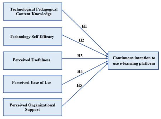 A review of recent studies has shown that certain variables are crucial to understanding the reasons behind the continuous intention to use e-learning. Regarding Davis’s TAM [65], it has been proven that PU and PEOU are the most influential factors in users’ continuous-use intentions. Interestingly, PU is more effective than PEOU when one wants to deal with the use of technology [60]. This study focuses only on two constructs within the TAM theory, which have proven effective in investigating the continuous use of technology; these are perceived usefulness and ease of use. [65] adopted the view that the perceived usefulness (PU) and the perceived ease of use (PEOU) of technology form the baseline for examining individuals’ usage intentions. PU is defined as the degree to which a person believes that using a technological system supports user performance, whereas PEOU tends to refer to the degree to which a person believes that use will be free of effort. Due to the fact that PEOU has proved to be of great significance only during the early-acceptance stage of technology use [54,65], PEOU may not directly affect teachers’ and students’ CU in the e-learning environment. Hence, we hypothesize the following: