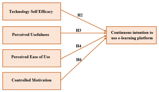 Self-efficacy is an effective factor that can reflect how students’ own belief in their abilities to use technology affects their acceptance of the learning environment. Therefore, self-efficacy and learning are two factors that can, interactively and dynamically, affect each other [59]. Self-efficacy in the e-learning environment is considered an intrinsic motivator as far as continuous intention is concerned. It usually refers to the degree of confidence that users have in making use of technology [60]. Technology self-efficacy is usually identified as the ability to use technology without facing any crucial problems. It embraces two subdivisions: the estimation of result (users’ estimations about their own input) and estimation efficacy (users’ estimations in achieving the final result) [61,62,63]. Within the environment of e-learning, self-efficacy is highly connected to users’ own beliefs regarding technology. Some believe that using technology is tremendously easy and achievable, while others may share a contradictory belief, as they may face problems in their ability to learn the appropriate way of using technology [64]. This simply implies that whenever users have a high level of technological self-belief, they may perceive the whole system properly; hence, they will be able to continue using the technology in a positive way. Accordingly, the following hypothesis may be formulated: