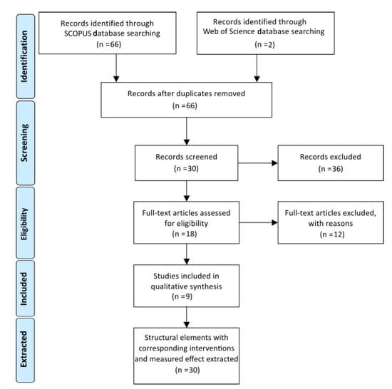 In total 68 articles were first identified, of which 66 were left after removing duplicates, 30 were left after the screening, 18 were left after eligibility checks and finally, 9 review articles were included in the final data extraction.